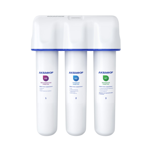 Три картриджа последовательно очищают воду от видимых механических примесей и растворенных вредных веществ. Блок механической очистки К5 продлевает ресурс сорбционных модулей, модуль глубокой очистки К2 – отфильтровывает частицы до 3 микрон. Третий модуль К7 обеспечивает финишную очистку от частиц до 0,8 микрон (что в 125 раз тоньше человеческого волоса).