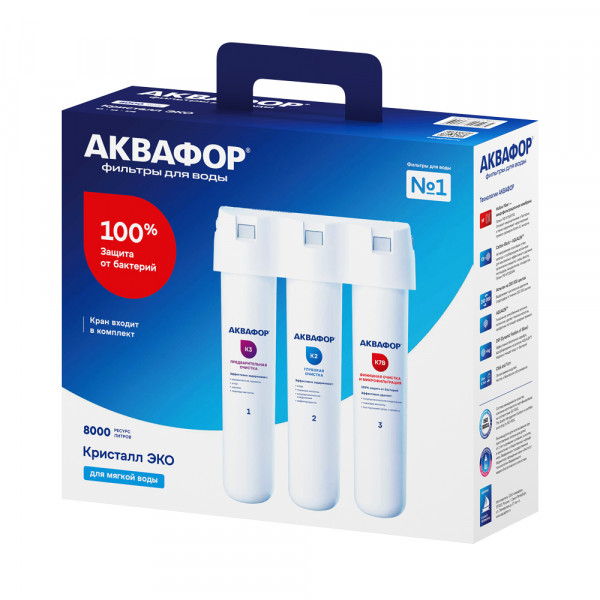Фильтр с половолоконной мембраной защищает от бактерий без бактерицидов. Также Кристалл Эко удаляет хлор, тяжелые металлы, пестициды, нефтепродукты и другие распространенные токсины и аллергены, сохраняя минеральный состав воды. Альтернатива обратноосмотическим системам для слабоминерализованной воды.