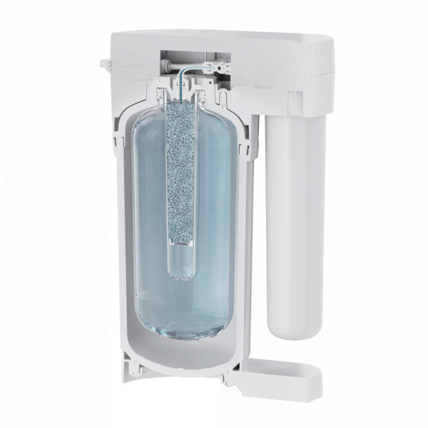 Минерализатор находится внутри накопительного бака. Благодаря постоянному контакту с природными минералами, очищенная вода приобретает сбалансированный состав и становится приятной на вкус.